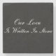 Stone coaster shown in marble in a colour of black with text: Our Love Is Written In Stone. Customise this item,change the stone,add names or buy as is..