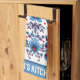 The rectangular shape of the kitchen towel provides an elegant canvas for the artwork. Deep blues evoke a serene and tranquil ambiance, while vibrant reds infuse the composition with lively and dynamic energy. These colours meld harmoniously, creating a captivating contrast that enchants the eye.