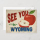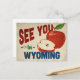 A charming Wyoming vintage travel postcard featuring a lovely red apple, along with fun retro style text that says, "See you in Wyoming"
