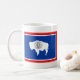 This mug design features the Wyoming flag on one side and a map of Wyoming on the other.