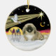 A sable Pekingese with a black mask watches three wise men make their way towards Bethlehem as a dove of peace hovers in the star light.