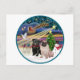 "Christmas Magic" includes two Pugs, one fawn, one black, along with the star of Bethlehem shining the way for three wise men, Santa and his reindeer flying through the night sky, a snowman, a decorated Christmas tree and a dove of peace.