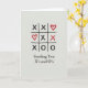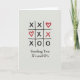 This greeting card shows a hand-drawn tic-tac-toe grid with slightly uneven black lines on an off-white background. Inside the squares, several black X’s set up the familiar game look. Instead of regular O’s, two red hearts appear in the grid, drawn with simple outlines that feel sweet and heartfelt ❤️. There’s also one red X, which ties the red accents together and makes the message feel more romantic. The mix of black marks and red hearts stands out clearly and keeps the focus on affection and connection 💌. Below the grid, the text “Sending You X’s and O’s” is printed in a classic serif font in black, centered near the bottom. It’s an easy, thoughtful way to say hugs and kisses—perfect with a little chocolate-and-card moment 🍫. Hope you’ll use it to share your Valentine’s Day feelings with someone you care about.