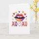 This greeting card shows a pair of open lips in the center, shaded from deep purple at the corners into red and then a warm orange-yellow toward the middle. The lips look glossy with small highlights, and a bit of white teeth shows inside, giving a flirty, friendly expression 🥰. Around the lips, hearts float outward in red, yellow, and purple, in different sizes so the whole scene feels lively. Near the bottom it says “XOXO” in thick, rounded letters, mixing orange, purple, and red tones that match the artwork. One of the “O” letters is replaced by a red heart, drawn simply so the message reads clearly as hugs and kisses ❤️.