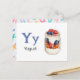 "Letter Y is for Yogurt" in our Alphabet Flash Card set. Get all 26 letters of the alphabet! A double-sided postcard that is great for memory games and teaching, geared for education, schools, teachers and homeschoolers for kindergarten and babies. All text is editable if you need to customise.
