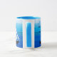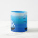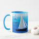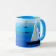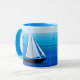 Mug in Semi abstract, minimalist poster art of a yacht at sea, on a cobalt and cerulean blue ocean background