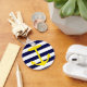 A bright yellow silhouette of an anchor is on a navy blue and white striped background. A fun, nautical design.