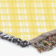 Yellow and gray patterned blanket with fringed edges, shown in both horizontal and vertical orientations on a white background.