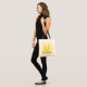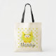 A cute owl of bright yellow and soft green with big eyes on a background of small yellow and green owls and an area you can easily add a name to personalise this owl tote bag!