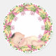Yellow and Pink Baby Shower Sticker with Baby laying on bottom of floral wreath