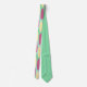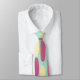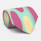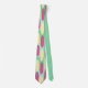 This necktie has a geometric design of made of a background of sea-green and light blue rectangles with yellow and purple ovals on top.