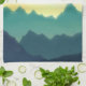 This digital painting shows a peaceful morning scene over the mountains in vibrant blue-green and yellow colours. The distant birds flying together add a touch of life, reflecting that time of day when the world seems to be just waking up.