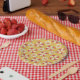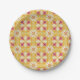 Two images of a decorative plate with a yellow background and symmetrical pink floral patterns. The top view shows the design front-on, while the angled view highlights the plate's gentle curvature. The tone is bright and cheerful.