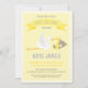 Adorable Yellow Baby Shower invitation featuring a stork making a special delivery; a baby bear. This makes a cute invitation for a gender neutral shower. Invitation also includes a patterned back side.