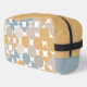 This toiletry bag design features a stunning combination of contemporary grey blue, beige brown, taupe, ochre yellow, and white coloured geometric circles, squares and half circles pattern on a crisp white background. The variety of whimsical shapes create a dynamic and rhythmic effect. The pattern is both ornate and elegant, with a touch of funkiness and hipster flair. There is also room to customise or personalise with a monogram or initial of your choice. Whether looking for a chic and modern style or a vintage and retro trend vibe, this pattern will suit your taste and personality.