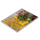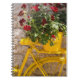 Against a stone wall, yellow-painted bicycle carries a pot of red geraniums. This notebook is fully customisable.