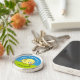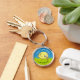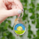 A cute and funny yellow bird cartoon on grass and sky background. Two text fields on circle.