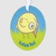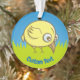 A cute and funny yellow bird cartoon on grass and sky background. Custom text on both sides.