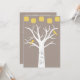 Lovely design perfect for both casual and semi formal weddings. Design features a white tree silhouette. Sitting in the white tree on the sprawling branches, are two lemon yellow birds. Carved into the trunk of the tree are three hearts. Inside the hearts is an area to include the bride and groom first name initials. Strung above the tree are lemon yellow paper lanterns. This design is on a grey / brown earth tone background. The reverse side of the wedding invitation is the same earth tone background and text in white font. The text is fully customisable to suit your needs. Matching RSVP Response cards and postage stamps also available.