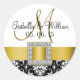 Classic Black and White Damask floral pattern with printed Metallic Gold Initial M Wedding Stickers for your wedding. This elegant design uses digital effects to PRINT the look of a yellow satin ribbon and diamond brooch and a 3D effect gold metallic monogram initial on a flat surface. Elke Clarke©2012 For different letters or initials, different colour ribbon, background colour or damask pattern please contact luxuryweddinginvitations@gmail.com.