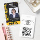 Simple vertical press ID in black with an eye-catching yellow color accent. News Media is written along the side, with Press beneath. Personalize this press ID template with the name of the reporter or photographer, their work title, ID photo, and the name of the publication that's sent this reporter out into the field. Add expiration date at the top. On the back of this practical journalist ID badge, personalize the QR code and add additional text.
