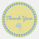 Dots and a small blue bouquet make this a very special thank you sticker. The background is a tangy lemonade yellow. There are two rows of dots. The smaller dots on the outside are lime green and the inner row of larger dots are cornflower blue. The blue matches the blue floral bouquet. Thank You is also blue and written in a hip and cool modern font.