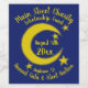 Design features an original marker illustration of a yellow moon and twinkling stars on a midnight blue night sky. Great for an evening gala or event.