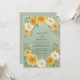 A soft sage background provides a gentle canvas for a vibrant, overflowing botanical arrangement. Delicate white and golden yellow blossoms, interspersed with lush green foliage, create a romantic and airy atmosphere. This design evokes a feeling of serene celebration and natural beauty.