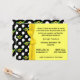 Stylish baby sprinkle shower invitation. Lovely graphics of yellow and green flowers on a black background, with white polka dots decorate the left side of this yellow invitation. Graphics of a pretty sunny yellow ribbon and bow, running vertical dividing the solid white text area from the flower and polka dot background. Text in black is ready to personalise for your baby shower event. Lovely invitation the mum to be will save for ever, with her new baby's keepsakes.