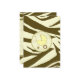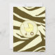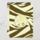 An invitation featuring a brown zebra print background over warm beige with light yellow trim. Personalise the brown text with details of your event. Opposite side is solid zebra print with a yellow baby carriage inside a matching circle shaped frame.