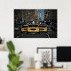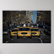A charge of New York City Yellow taxi cabs make their way swiftly down 6th Avenue towards Washington Square Park in midtown Manhattan