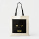 Photograph of a black cat on black background with yellow eyes glowing. Customisable, removable text, "Boo!" printed below in yellow.