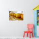 Photograph of yellow wheels resting on a wooden shelf. Customizable text, "Cheese" printed in corner.