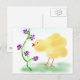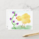 Painting of a little yellow chick smelling purple flowers. ©janet Palaggi