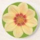 Protect your table top from water marks and stains with this extra-large, round, sandstone beverage coaster that features the photo image of a yellow Dahlia flower on a lime green background. A lovely, floral design!