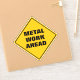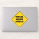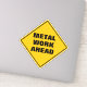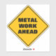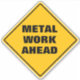 Funny classic yellow diamond caution road sign warns of metal work ahead in a thick black sans serif font, which is a warning sign for the road work sign that will be coming up next.