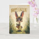 This charming Easter card showcases an adorable baby bunny in a light yellow dress and a colorful flower crown, holding a basket of decorated eggs. Surrounded by painterly meadow greens, warm sunlight, and fluttering butterflies, the artwork blends whimsical storybook charm with a soft, hand-painted feel. Perfect for kids, families, and anyone who loves sweet, uplifting spring designs. Printed on premium cardstock for a beautiful seasonal keepsake.