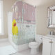 Yellow rubber duck with bubbles and pink tiles, pop art, abstract, Bizarre with the tagline" wanna shower !!! "