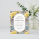This design features an elegant botanical vintage pattern of flowers and leaves in retro style in cheerful watercolor palette of Yellow Dusky blue Brown your wedding details displayed in a modern combination of fonts over a white oval frame with a chic brown border. Perfect for summer or spring celebration, or outdoor or garden wedding with a vintage touch.