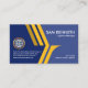 A creative yellow shades border design that is shaped into an abstract eagle. It demarcates the left dark blue layer against the lighter counterpart on its right. The eagle border symbolises a forward movement, a movement to success. At the top corner sits your prestigious name and job title with a slogan caption near the baseline. You can change the caption to suit your service needs. Moving across to the left layer, is the gold globe logo you can use with its business name and contact details.