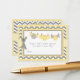 Grey and white chevron print with yellow accents with tutu and diapers on clothesline and bird perched on elephant with bow-tie and a 3D-look polka-dot bow diaper raffle ticket design for a baby shower.