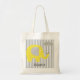 A cute elephant design tote bags sure to please both kids and adults who love elephants, features a cute yellow elephant with grey pattern ears and a grey chevron striped umbrella on an grey and white striped background.