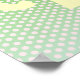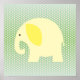This cute and whimsical yellow elephant sits on a fading mint green background with pink polka-dots. Perfect for decorating baby's room!