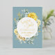 This modern floral wedding Save The Date card features a stylish and elegant bouquet of yellow watercolor roses, complemented with delicate greenery and accented with real foil golden leaves over a classy dusty blue background. Easily add your wedding details in true golden foil fonts.