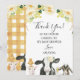 Sweet farm animals themed baby shower thank you card featuring some lovely yellow or gender neural floral arrangements and five cute farm animals. This oink, moo, neigh, farm or farmyard baby shower card is ideal for a gender neutral farm themed baby shower and a sweet way to thank guests for coming to your farm themed baby shower.