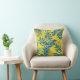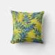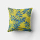 Yellow throw pillow with vibrant blue and green tropical leaf patterns on both sides, creating a fresh and lively tropical vibe.
