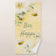 Yellow, white background with a honeycomb pattern. Decorated with light yellow, cream coloured tropical florals flowers, hibiscus and happy bumble bees. The text: Bee Happy. Green hand lettered text. Perfect for your summer home, beach house or vacation home!
