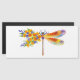Artistically painted, floral dragonfly in contrasting orange and purple with yellow, bright, blooming California poppy and blue wildflowers on white background.