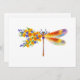 Artistically painted, floral dragonfly in contrasting orange and purple with yellow, bright, blooming California poppy and blue wildflowers on white background.