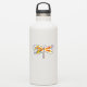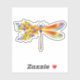 Artistically painted, floral dragonfly in contrasting orange and purple with yellow, bright, blooming California poppy and blue wildflowers on white background.